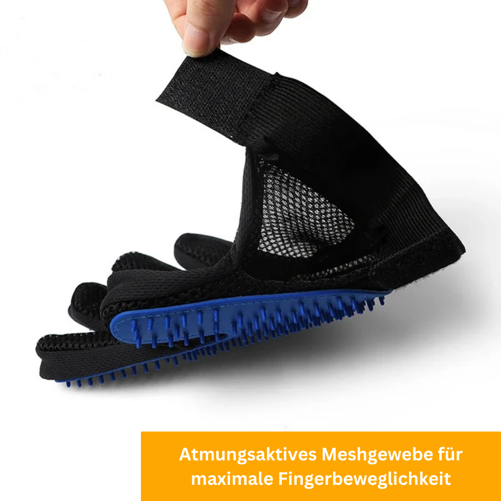 Dank des durchdachten Fünf-Finger-Designs und des atmungsaktiven Mesh-Materials bietet unser Handschuh volle Bewegungsfreiheit für deine Finger. So kannst du auch schwer erreichbare Stellen mühelos pflegen und sicherstellen, dass dein Haustier rundum gepflegt ist.