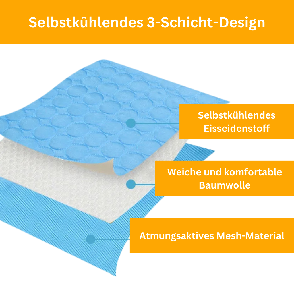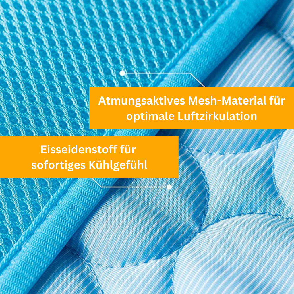 Der speziell entwickelte Eisseidenstoff sorgt für ein sofortiges kühlendes Gefühl, während die atmungsaktive Rückseite aus Mesh-Material eine optimale Luftzirkulation gewährleistet.